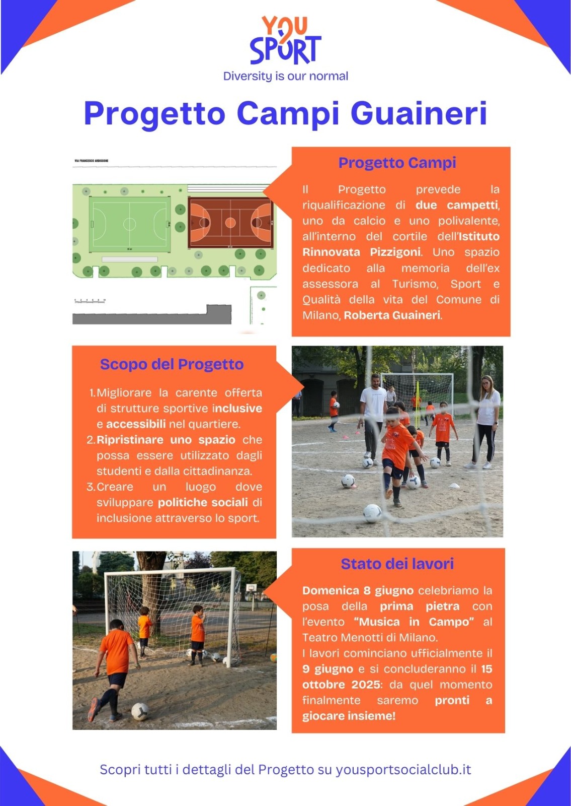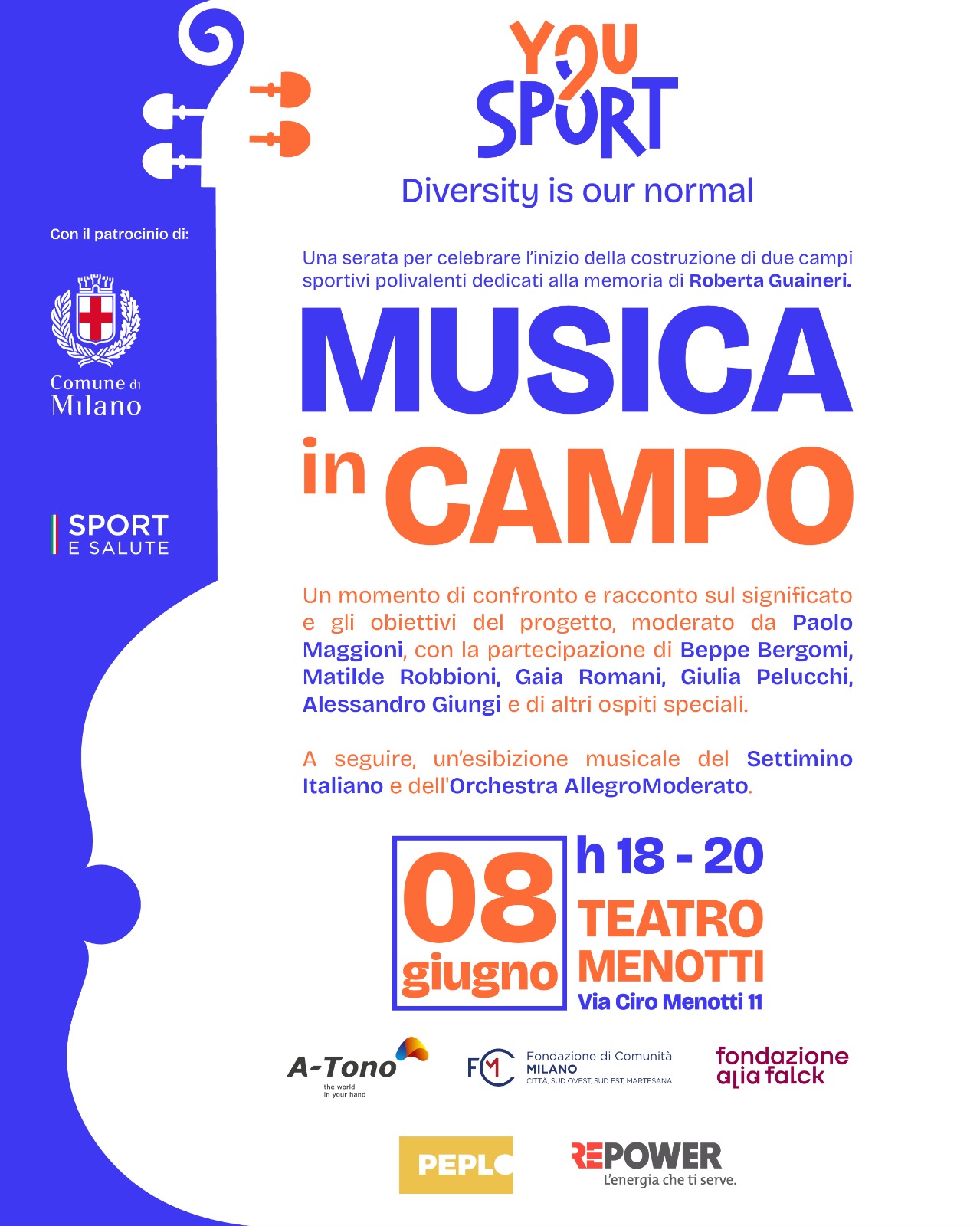 Siamo invitati alla cerimonia/spettacolo per celebrare in musica l’apertura del cantiere per i lavori di riqualificazione promossa da YouSport dei due campi sportivi polifunzionali della scuola Dante Alighieri, intitolati alla memoria di Roberta Guaineri.Sarà un’esperienza musicale unica grazie alle esibizioni del “Settimino Italiano” (composto da musicisti della Scala e dell’Orchestra Filarmonica) e dell’Orchestra di AllegroModerato.La serata sarà moderata da Paolo Maggioni (scrittore e giornalista di RaiNews)con la partecipazione diGaia Romani, Assessora alla Partecipazione del Comune di MilanoGiulia Pelucchi, Presidente del Municipio 8Beppe Bergomi, Campione del Mondo e Opinionista TV per SkyMatilde Robbioni, Portiera dell’Internazionale FC e della Nazionale U17… e tanti altri ancora!Per il nostro Istituto abbiamo 200 posti gratuiti, ma è possibile effettuare una donazione a YouSport.E’ necessario prenotarsi in modo da organizzare al meglio l’accoglienza in sala entro venerdì 30 maggio al link https://forms.gle/Y3gXA12akmqLYnwi7