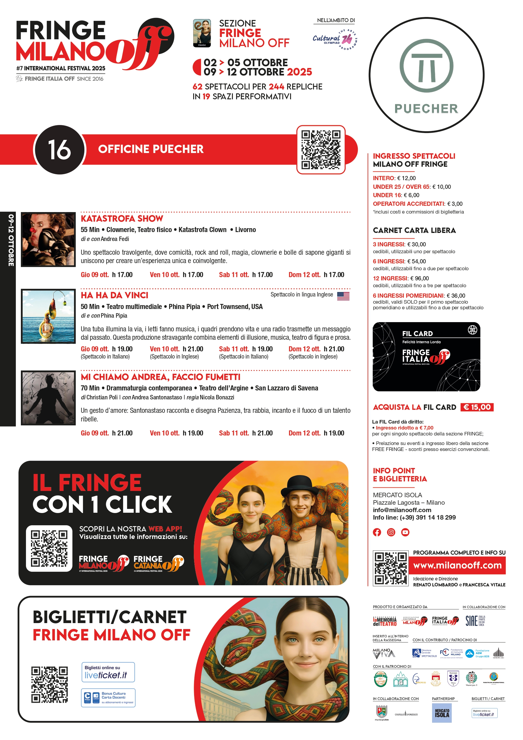 Tutti i nostri studenti di primaria e secondaria hanno diritto al biglietto ridotto (6 euro) previa prenotazione al seguente MODULO: https://forms.gle/F2UkEfqCxDbT7V6x8 Per gli adulti è possibile prenotare con lo stesso modulo ma volendo portarsi avanti anche acquistare direttamente il biglietto intero al seguente link: https://www.liveticket.it/fringemilanooff o 30 minuti prima dell’inizio dello spettacolo direttamente presso la scuola secondaria di primo grado G. Puecher – via Castellino da Castello 9, Milan
